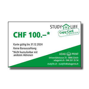 Depot für die CopyCard: CHF 5.– (wird erstattet, wenn die Karte zurückgegeben wird, keine Auszahlung des Restwerts).